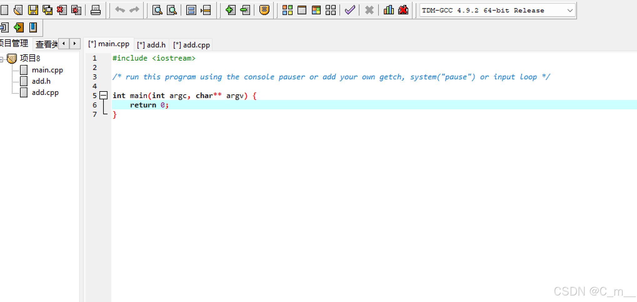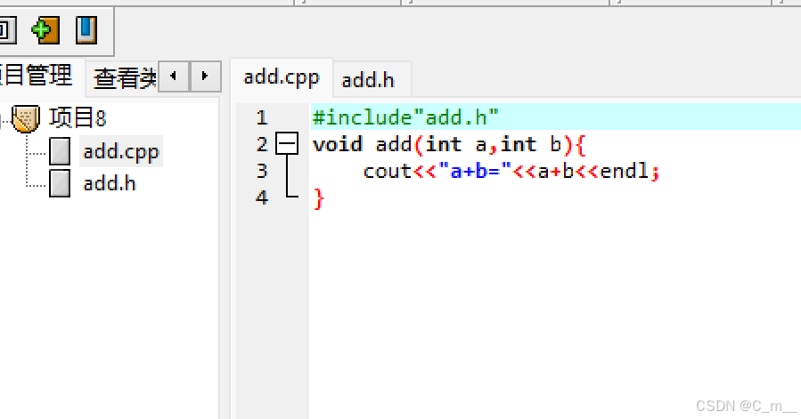 今天先写一个最简单的函数--add,两个量相加。在.h的头文件中写函数声明;在.cpp的源文件中写函数的定义(源文件中需要包含头文件),实现函数分文件编写。