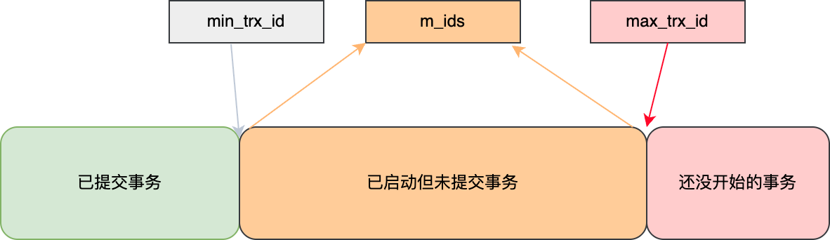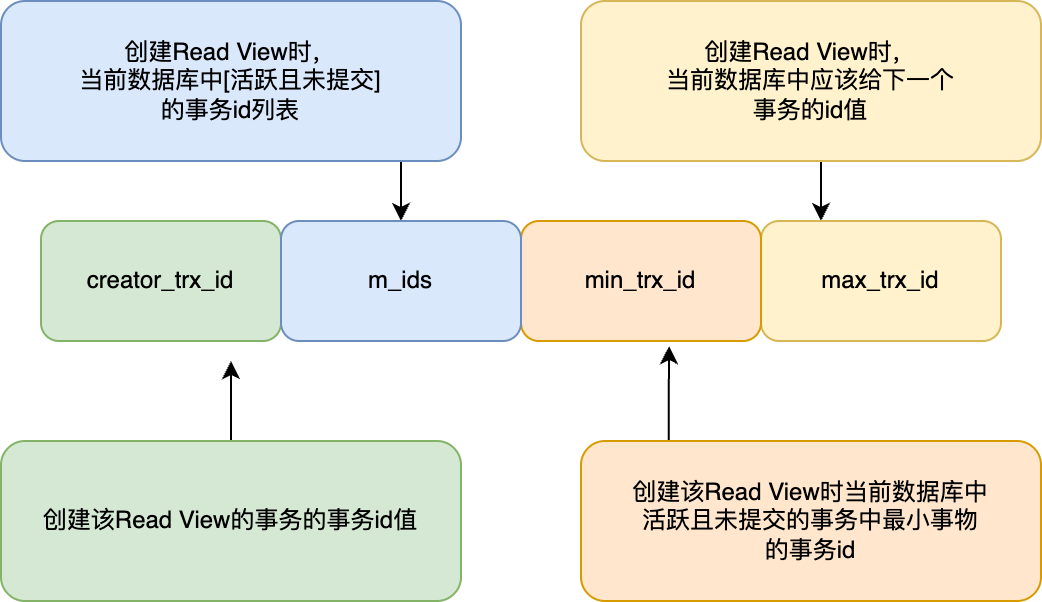 - min_trx_id:指的是在创建Read View时,当前数据库中「活跃事务」中事务id最小的事务,也就是m_ids的最小值。