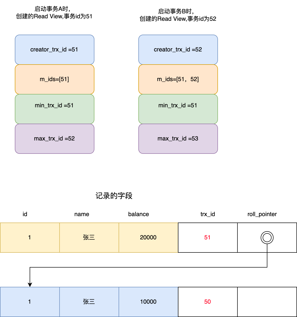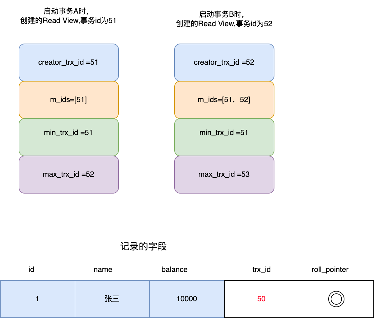 假设事务A(事务id为51)启动后,紧接着事务B(事务id为52)也启动了,那这两个事务创建的
