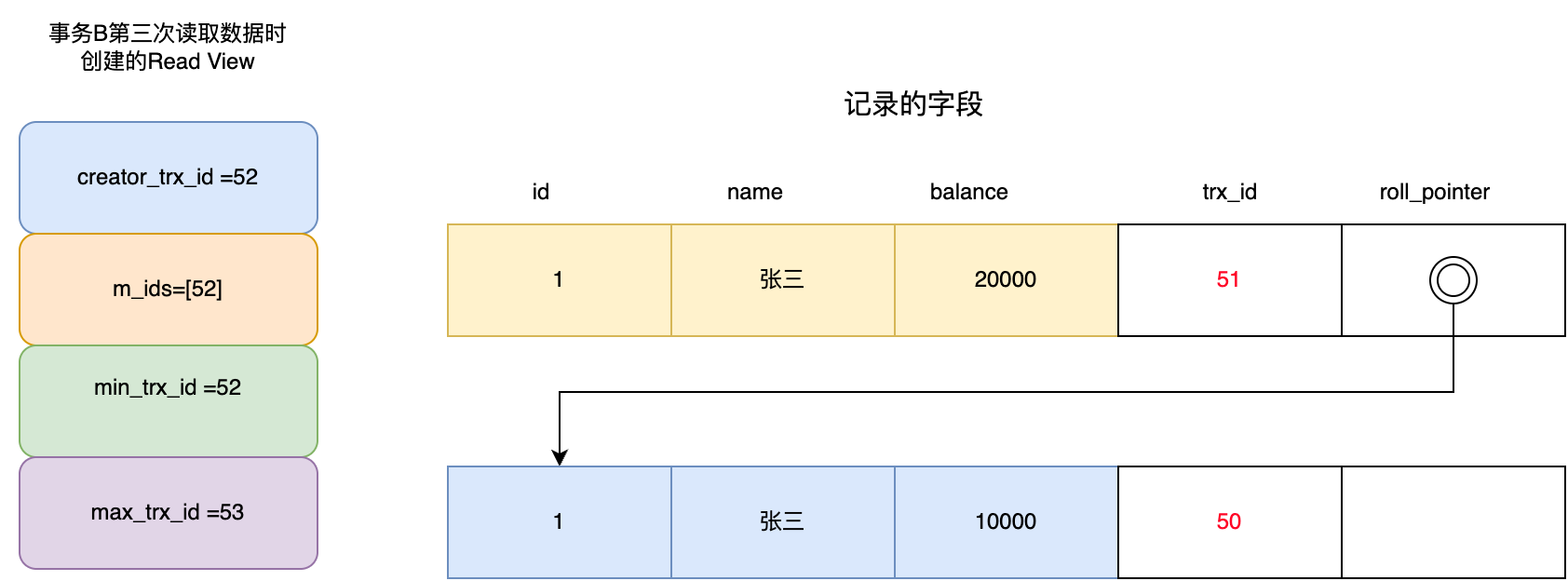 事务B在找到张三这条记录时,会看这条记录的trx_id是51,在事务B的Read View的min_trx_id和
