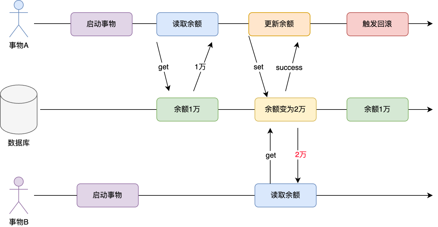 假设有A和B这两个事务同时在处理,事务A先开始从数据库中读取张三的余额数据,然后再执行更新操作,如果此时事务A还没有提交事务,而此时正好事务B也从数据库中读取张三的余额数据,那么事务B读取到的余额数据是刚才事务A更新后的数据,即使没有提交事务。
