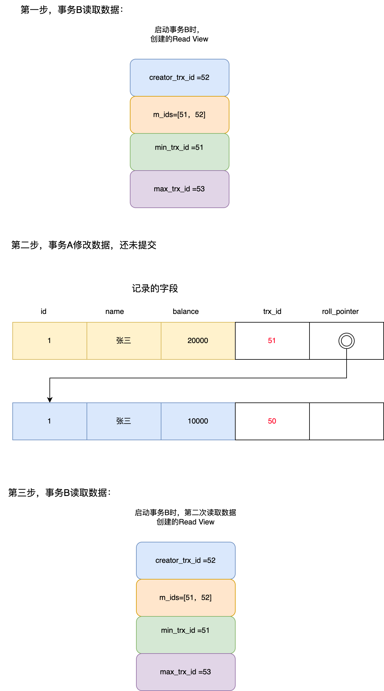 那具体怎么做到的呢?我们重点看事务B每次读取数据时创建的Read View。前两次事务B读取数据时创建的Read View如下图: