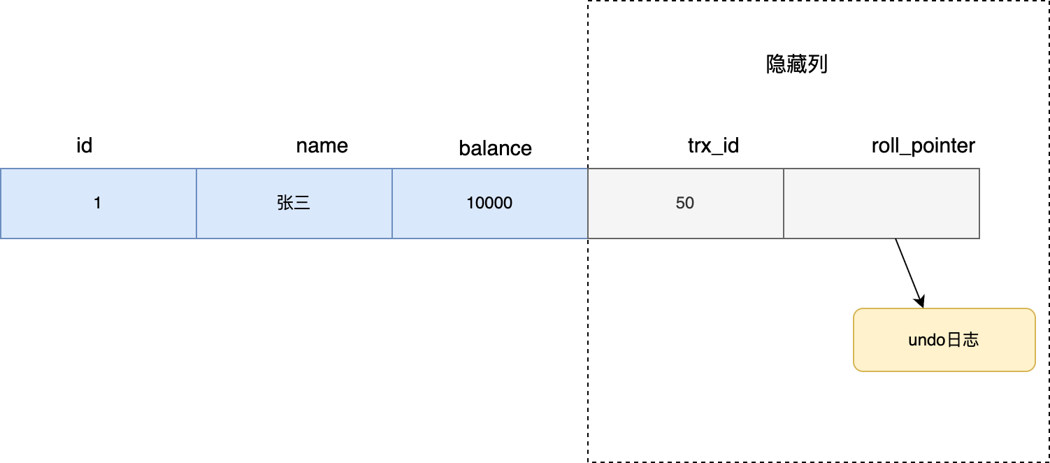 假设在账户余额表插入一条张三余额为1万的记录,然后我把这两个隐藏列也画出来,该记录的整个示意图如下:
