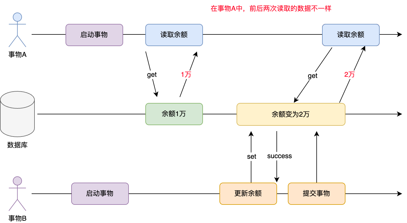 假设有A和B这两个事务同时在处理,事务A先开始从数据库中读取张三的余额数据,然后继续执行代码逻辑处理,在这过程中如果事务B更新了这条数据,并提交了事务,那么当事务A再次读取该数据时,就会发现前后两次读到的数据是不一致的,这种现象就被称为不可重复读。