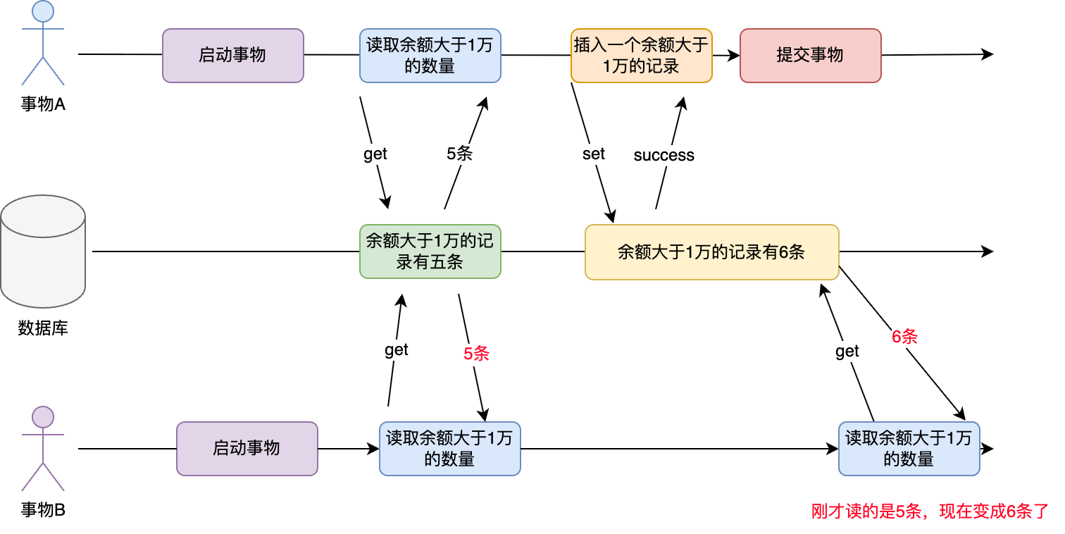接下来,事务A插入了一条余额超过1万的记录,并提交了事务,此时数据库超过1万余额的记录个数就变为6。