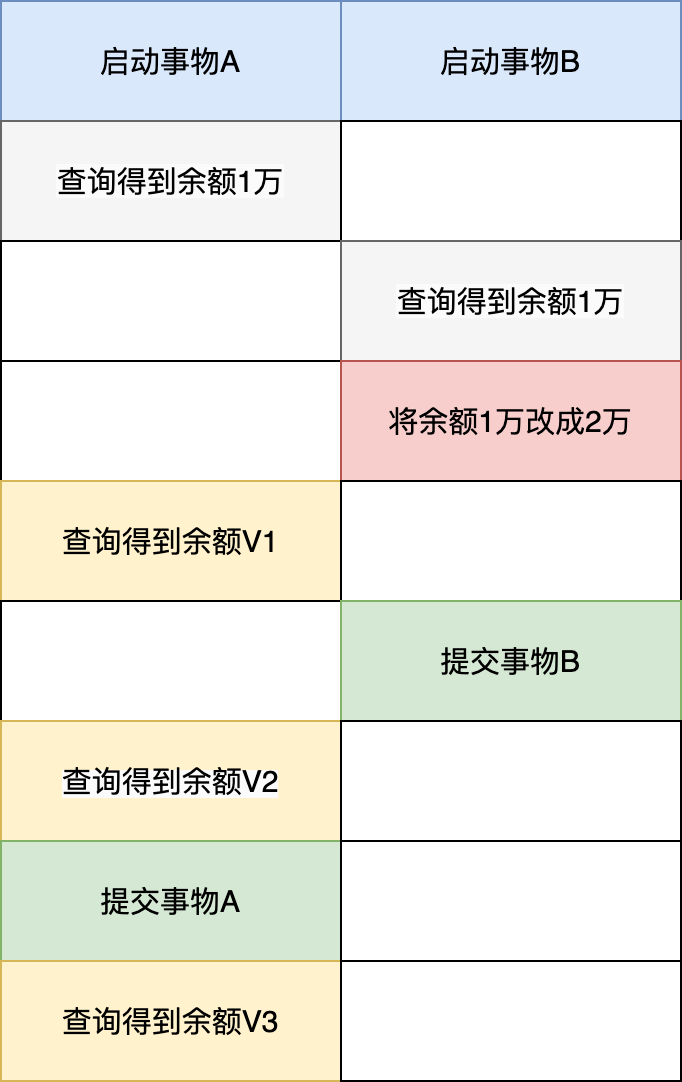 接下来,举个具体的例子来说明这四种隔离级别,有一张账户余额表,里面有一条账户余额为1万的记录。然后有两个并发的事务,事务A只负责查询余额,事务B则会将我的余额改成2万,下面是按照时间顺序执行两个事务的行为: