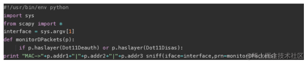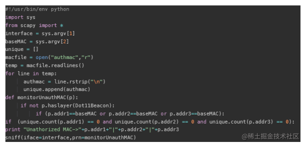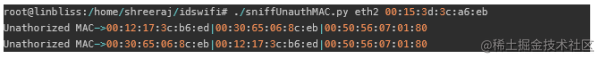 从未经授权的MAC地址来的解密和解除分组包可以清楚地表明这是⼀个攻击⽹络的⾏为。 他们可能会是拒绝服务 (DoS)或中间⼈(man-in-the-middle)攻击。 以下脚本可以报告这些数据包,并附有MAC地址。 如果接⼊点未重 新启动,并且这些数据包是可观察的,则有⼈可能会在客户端注⼊这些数据包。