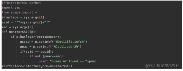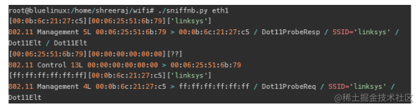 接⼊点被配置为以某种规则的间隔发射信标管理帧(emit beacon management frames)。 这些帧包含关于SSID,MAC地址,时间戳等信息。⼀旦eth1 网卡处于监听模式,⼈们就可以开始访问信标帧。 您可以使⽤Scapy访获取些数据包,如下所⽰: