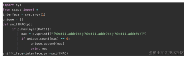⼀个站点的MAC地址是确认⼀个⽆线⽹络⾝份的关键点。 Dot11数据包在头部有四个地址(见图1)。 Addr1是收 件⼈的地址,addr2是发送者的地址。 这些MAC地址可以很容易地被收集。 这是⼀个简单的脚本来捕捉它们: