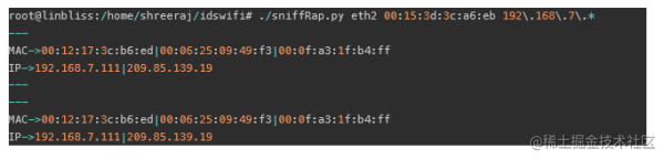 上⾯的脚本⽤来捕获所有数据包,并深⼊到IP层。 ⼀个⽤来报告的点是数据包的源和⽬标IP地址。 如果这些数据 包不是由MAC地址定义的授权接⼊点的⼀部分,则标记它们。 这可能是运⾏在192.168.7.0上的潜在接⼊点。 ⼀旦 您发现⼊侵,您可以从有线端检验他们的存在和流量以减少误报。 此⽰例使⽤正则表达式来⽐较这些⽹络。 这是 脚本的输出结果: