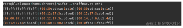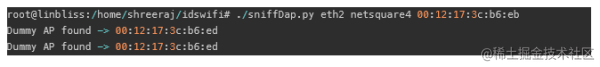 前⾯的脚本使⽤⼀个带有基地址和SSID的授权接⼊点,嗅探其信标包,同时使⽤不同的基本MAC寻找相同的 SSID。 该脚本报告任何和所有接⼊点,如下所⽰: