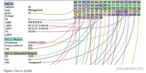 此帧可以帮助你确定关键信息,如接⼊点的MAC地址,SSID和WEP⽀持情况。 您可以为所有不同的Dot11数据包 和帧构建⼀个相同的视图。 该视图对学习802.11标准有很⼤的帮助.