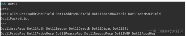 您可以嗅探⾮信标数据包,并尝试确定隐藏的接⼊点或隐藏的SSID。 管理帧的探测和关联会显⽰这些值。 Scapy 还⽀持⼏个层,如下所⽰: