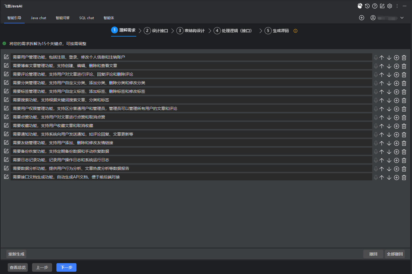 开发头一步是把需求弄明白,这对新手来说,常是道坎。但在飞算JavaAI 里头,只要敲进 “个人博客系统” 这项目名,它立马就启动需求生成的本事。没多大功夫,一份列着用户注册登录、文章发布编辑、评论互动、分类归档这些核心功能的清单就出来了。要是觉得有些功能暂时用不上,比如评论功能,直接在生成的清单里改改就行,整个过程就像做选择题,不用费脑筋想 “该有哪些功能”。