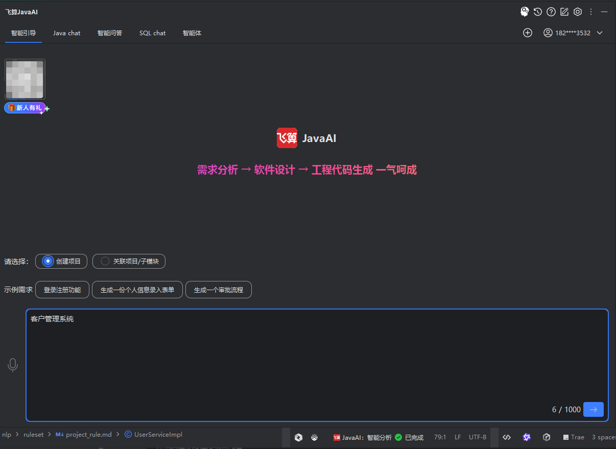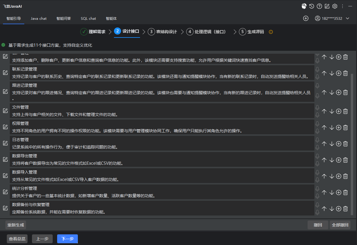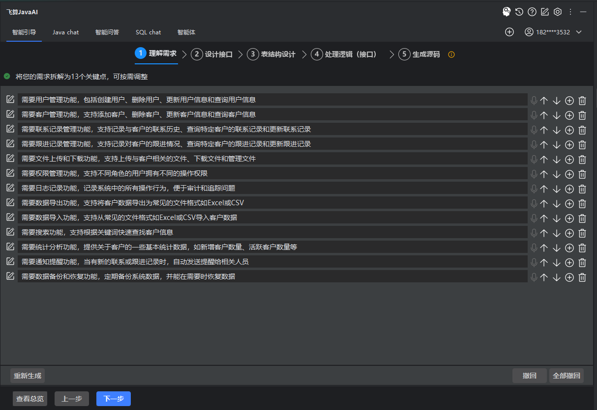 作为一款 IDE 插件,飞算 JavaAI 的核心本事,就是把日常的自然语言,一键转化为条理清晰的结构化需求分析。传统模式下,光是和各方反复沟通确认需求就得耗掉大半时间,而它只需简单输入。比如你想开发一套客户管理系统,只需敲入 “客户管理系统”,10 秒内就能拿到一份包含客户信息录入、标签管理、消费记录等模块的需求清单,甚至会贴心标注各模块的优先级和关联逻辑,像 “客户标签管理需与消费记录模块联动” 这样的细节也不会漏掉。