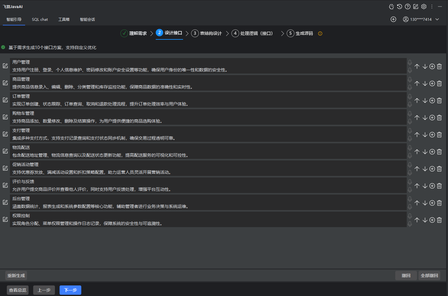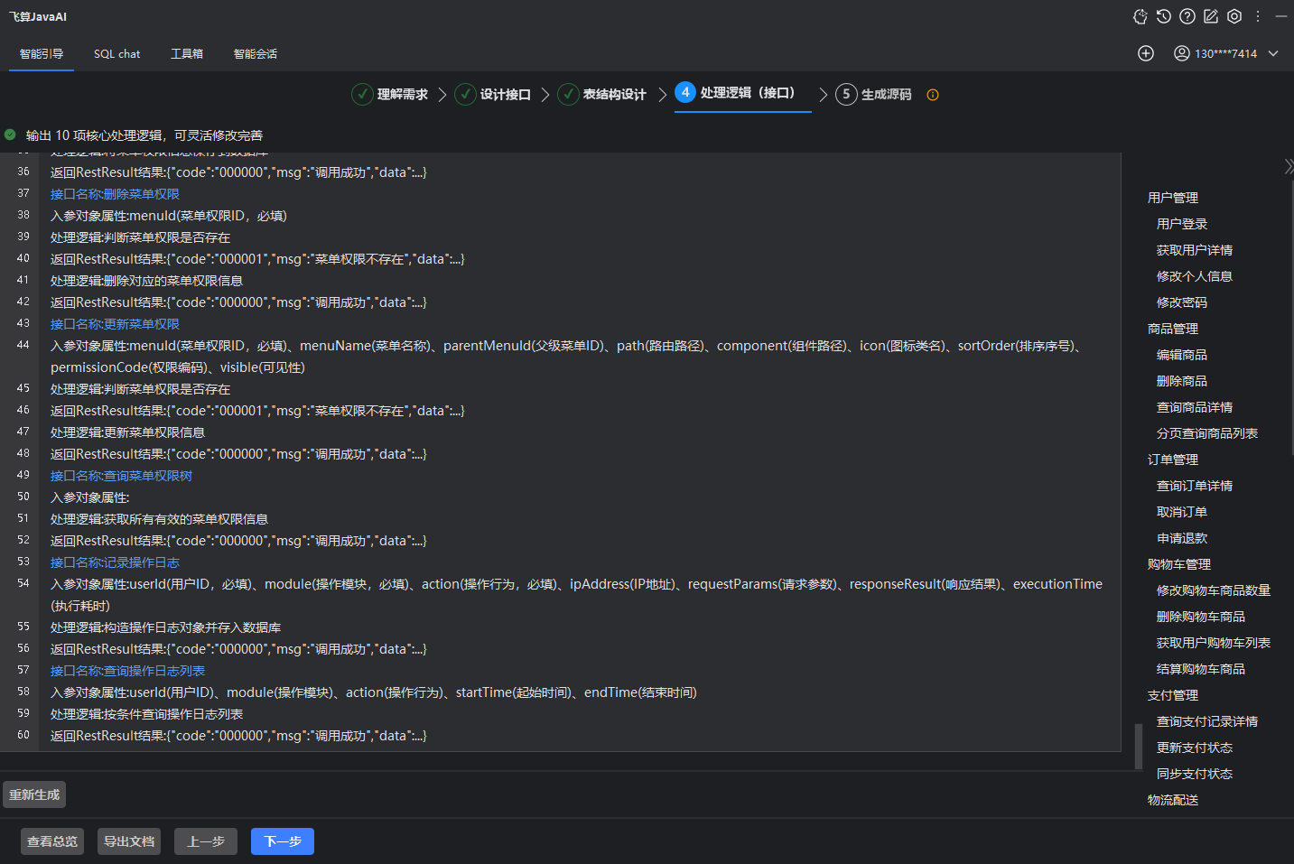 到了软件设计阶段,飞算 JavaAI 能实现接口和表结构设计一站式生成,让复杂设计变轻松。你想想,以前要花好几天琢磨接口参数、返回值类型,还要反复梳理复杂的数据库表结构,现在有了它,分分钟就能把这些设计得明明白白。不仅如此,它还能帮你理清业务流程,那些曾经让人头疼的复杂功能设计,在它面前都成了简单的小事,让你轻松应对设计难题。它还能把像乱麻一样的业务逻辑,拆分成详细且可执行的代码流程。就拿库存更新来说,从接收用户的下单请求、验证商品库存数量,到更新数据库里的库存数据、给用户反馈操作结果,每一个步骤都安排得妥妥帖帖。而且,要是你根据实际业务情况想修改部分逻辑,它就像个贴心的助手,会结合上下文智能调整优化整体逻辑,完全不用担心会出现逻辑漏洞,稳稳地实现 “生成 - 反馈 - 再优化” 的完整闭环。