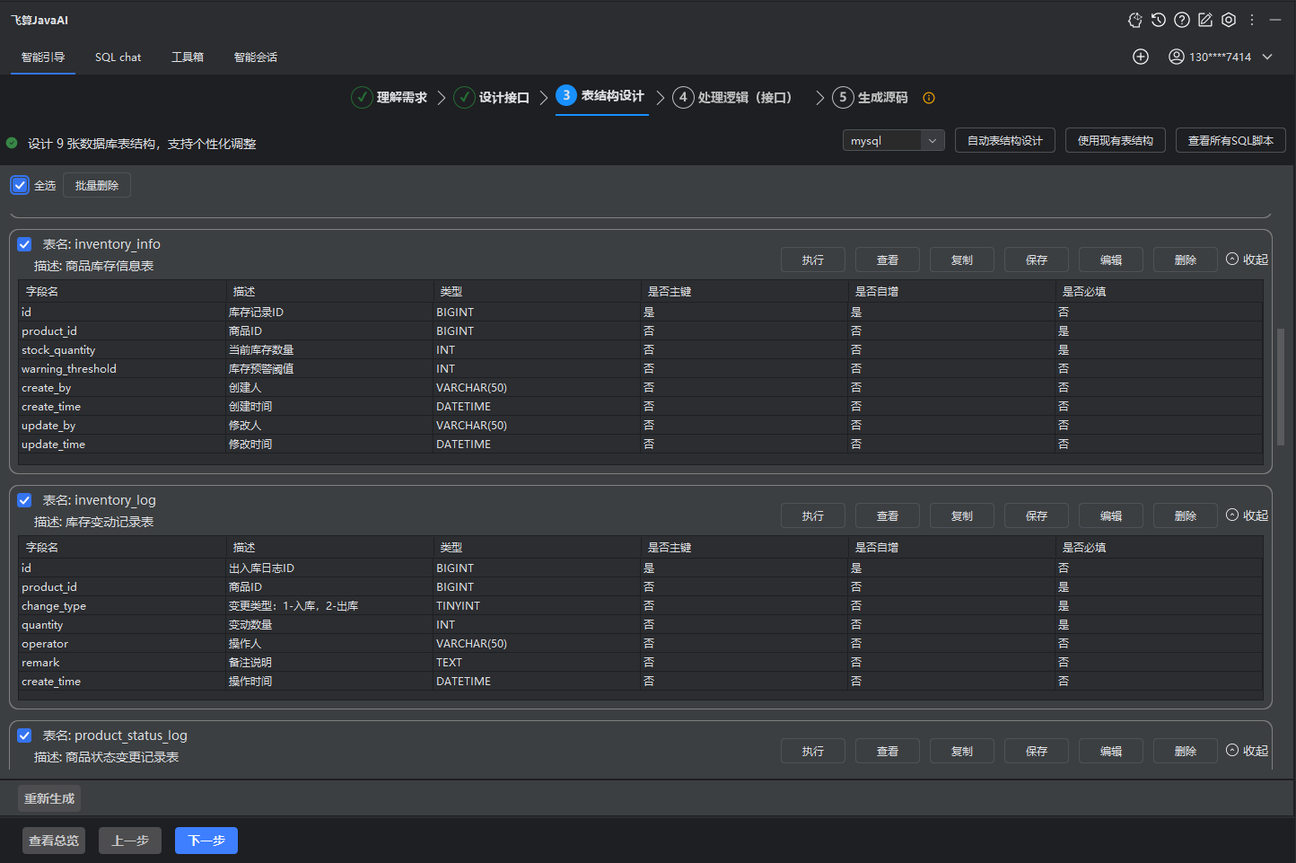 至于数据库表结构设计,再也不用对着 ER 图发呆了。选择 “自动生成” 功能,飞算JavaAI 会根据接口需求,自动创建 order(订单表)、product(商品表)、inventory(库存表)等核心数据表,就连创建时间、更新人这类审计字段都安排得妥妥当当。你只需复制生成的 SQL 脚本执行,数据库就能直接投入使用;若想复用旧项目的数据库表,只需连接数据库并选择目标表,插件的字段匹配功能智能得仿佛拥有多年开发经验,能精准完成字段关联。