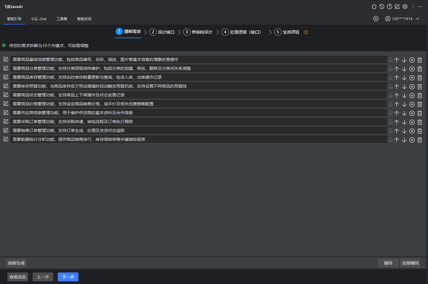 想开发商品管理 API?打开飞算JavaAI 插件,对着麦克风说一句 “需要带库存预警和分类管理功能的商品管理系统”,系统会立刻将这句话拆解为完整的需求清单,涵盖功能模块、业务规则等核心要点,无需你再逐一梳理。