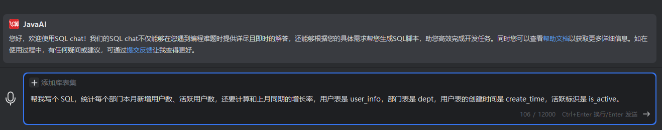 上周做项目报表时,领导突然要 “统计每个部门本月新增用户数、活跃用户数,还要对比上月同期增长率”。要是搁以前,我得先画半天逻辑图,把用户表和部门表的关联关系捋顺,再一点点拼凑 SQL 语句,光调试可能就得一小时。但那天我直接打开飞算 JavaAI 的 “SQL Chat” 面板,像发微信消息一样敲了一行:“帮我写个 SQL,统计每个部门本月新增用户数、活跃用户数,还要计算和上月同期的增长率,用户表是 user_info,部门表是 dept,用户表的创建时间是 create_time,活跃标识是 is_active。”