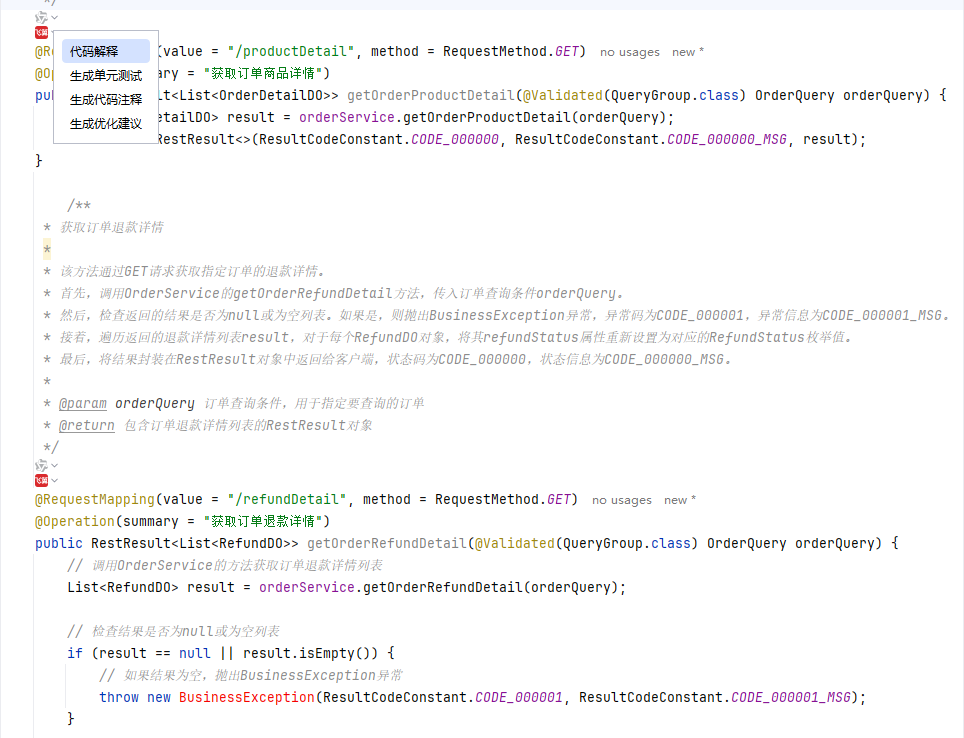 飞算 JavaAI 不仅能快速生成 Spring Boot 配置和基础代码,还具备强大的代码优化能力。生成的代码遵循 Java 代码规范,结构清晰、可读性高。它会自动进行语法检查和修正,避免常见的语法错误,如括号不匹配、变量未定义等问题。在逻辑优化方面,对于复杂业务逻辑的代码实现,飞算 JavaAI 会采用合理的算法和设计模式进行优化。例如在商品查询功能中,如果涉及多条件查询,AI 生成的代码会使用高效的 SQL 语句编写方式,合理利用索引,提升查询性能。同时,它还会对代码进行规范性调整,如统一代码风格、合理添加注释等,使代码更易于维护和后续扩展。这一系列的代码优化操作,使得生成的 Spring Boot 项目代码质量更高,首次编译成功率显著提升,为开发者后续的开发工作奠定了良好基础。