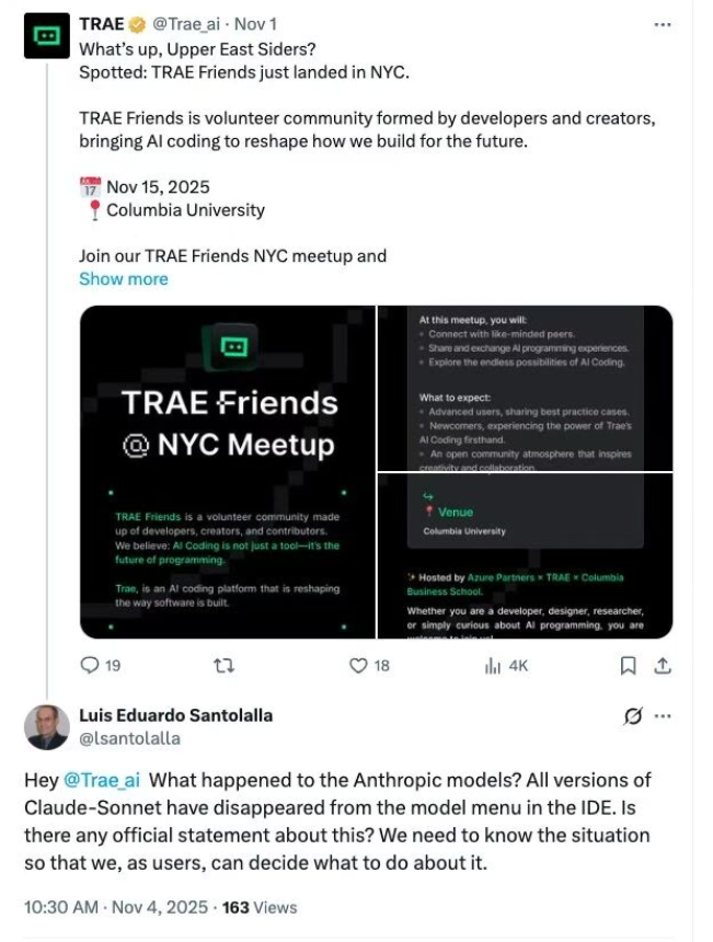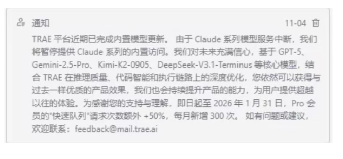 近日,AI工具平台Trae的一则公告在Java工程师圈子里引起了广泛关注。11月4日,Trae宣布由于服务中断,将不再提供Claude的访问权限。这一消息对于那些长期依赖Trae平台进行Java开发的工程师来说,无疑是一个沉重的打击。