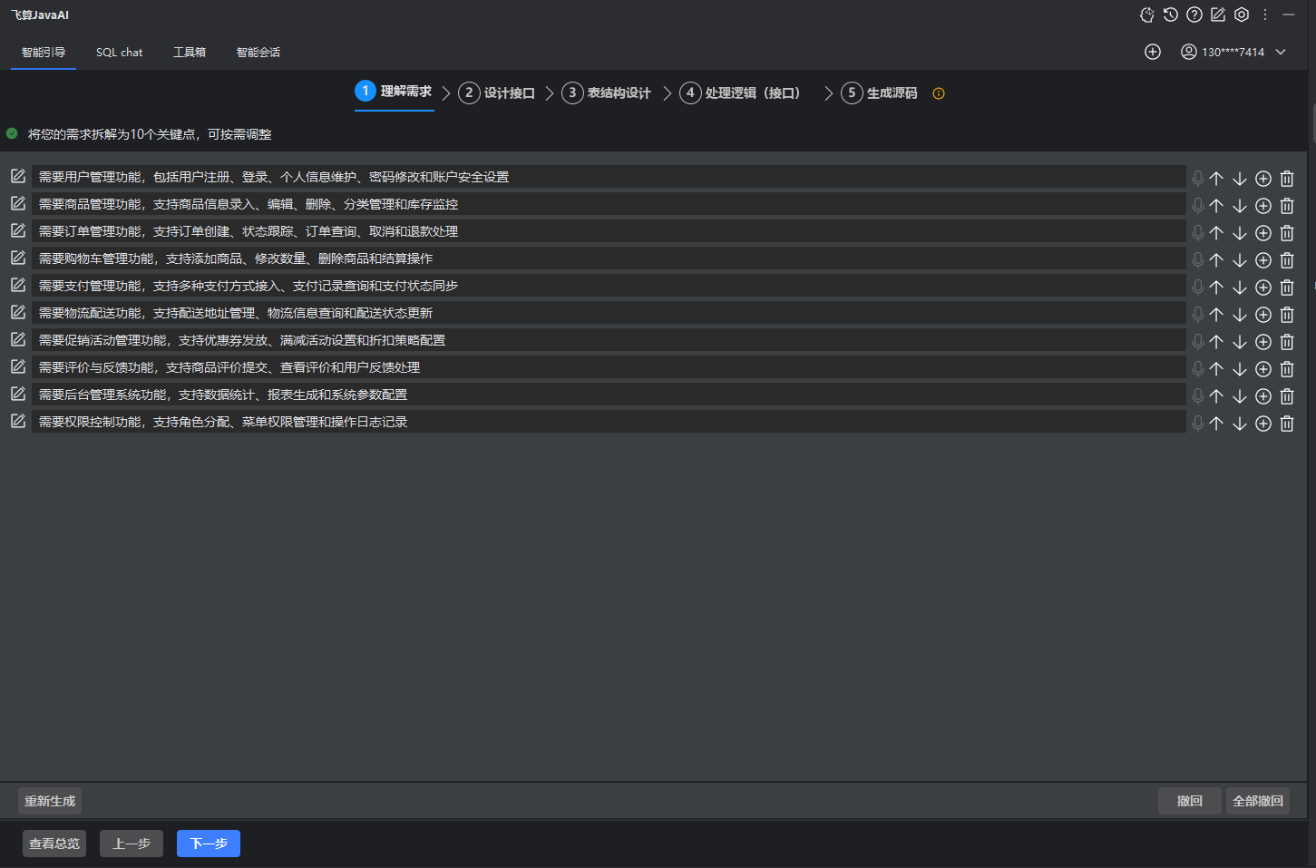 在软件设计阶段,飞算JavaAI 化身“设计大师”,实现接口和表结构设计的一站式轻松生成。想象一下,原本需要耗费大量时间和精力去思考的接口参数、返回值类型,以及复杂的数据库表结构,在它的帮助下,瞬间就能设计得井井有条。它还能帮你梳理业务流程,将那些错综复杂的业务逻辑拆解成详细、可执行的代码流程。以库存更新为例,从接收下单请求、验证库存,到更新数据、反馈结果,每一个步骤都被安排得恰到好处。而且,如果你根据实际业务需要对部分逻辑进行修改,它会像一个聪明的助手一样,结合上下文智能优化整体逻辑,确保不会出现任何逻辑漏洞,真正实现“生成 - 反馈 - 再优化”的完美闭环。