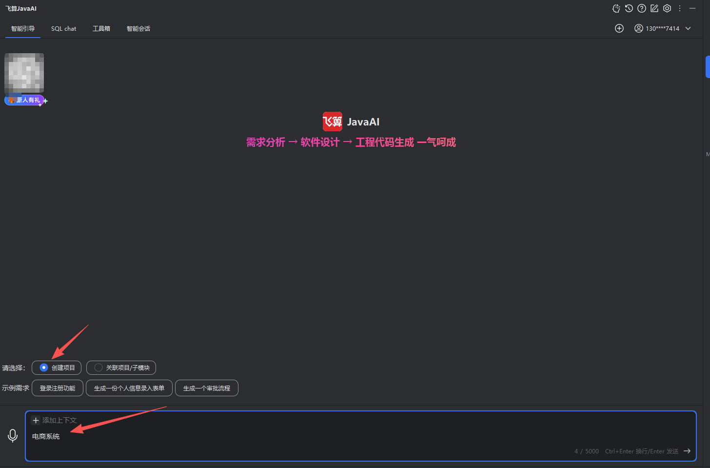 智能引导操作:选中创建项目选项,输入“电商系统”指令,即可开启高效开发之旅。