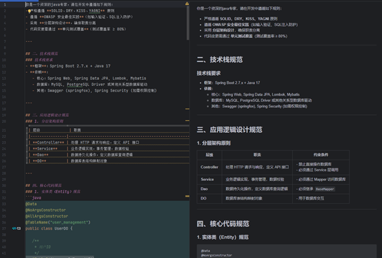 工具首先解析项目现有结构,识别技术栈和架构特征。通过静态代码分析,自动生成包含分层架构、编码规范和安全要求的项目规则文件。