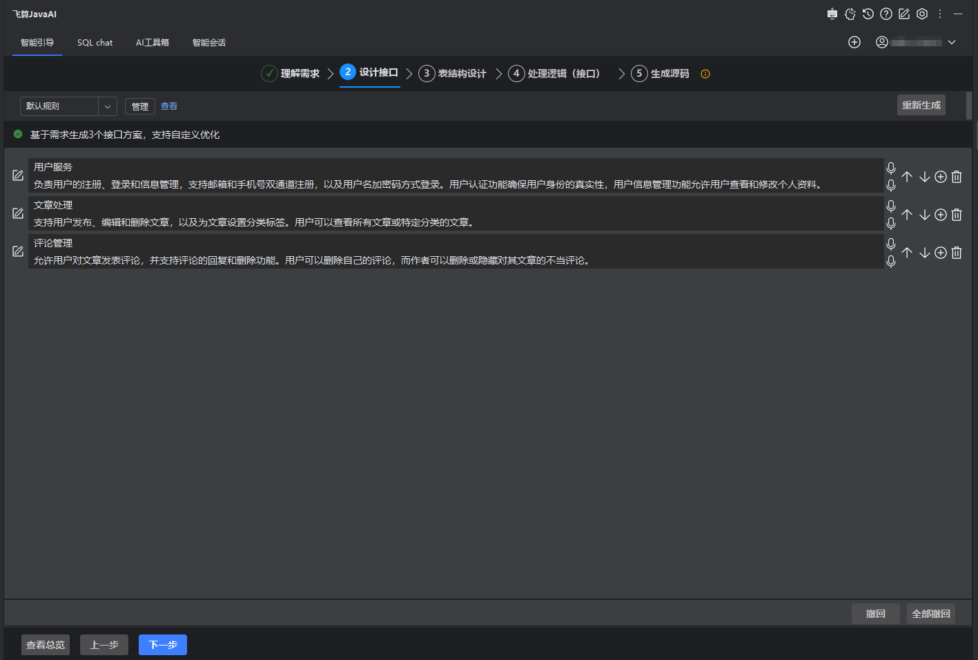 - 接口规划设计:基于RESTful规范生成完整API列表,包含接口路径、请求方法及核心职责说明,形成标准化接口契约。