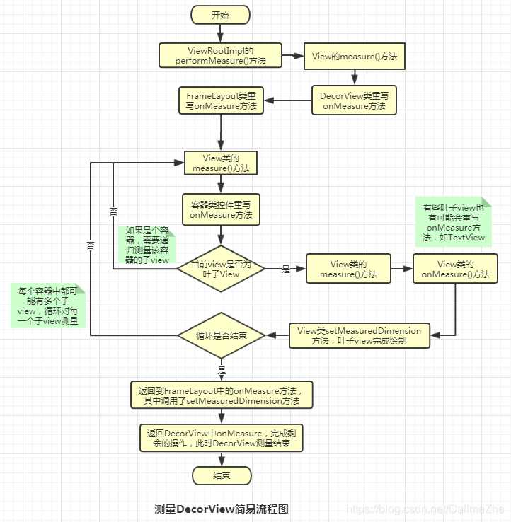 onMeasure()方法顾名思义就是用于测量视图的大小的。View系统的绘制流程会从ViewRoot的performTraversals()方法中开始,在其内部调用View的measure()方法。简单来说,ViewGroup中负责调用所有子View的测量方法,子View中负责实际的测量并设值。在子View中若发现有ViewGroup类型,再调用所有子View的测量方法,周而复始,直到当前View没有包含