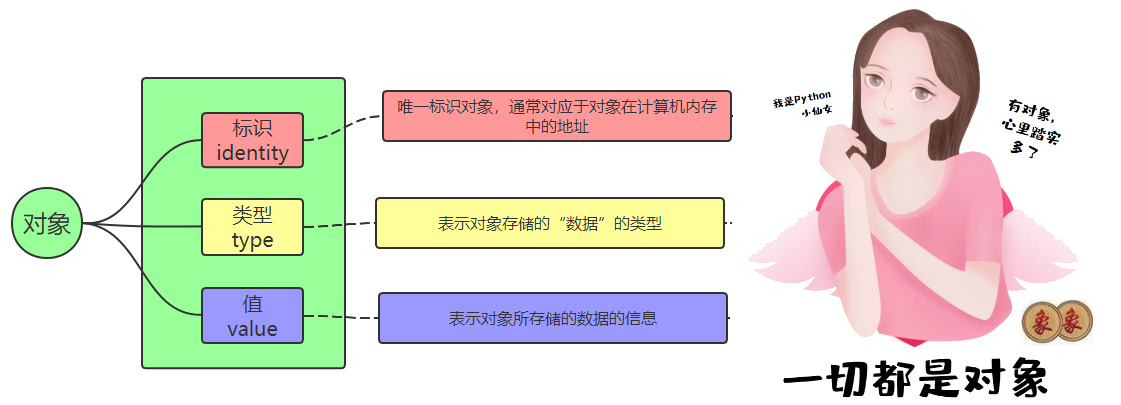 - 值表示对象所存储的数据的信息。使用print(obj)可以直接打印出值。