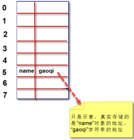 当调用a.get(“name”),就是根据键“name”查找到“键值对”,从而找到值对象“gaoqi”。