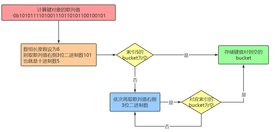 由于数组长度为8,我们可以拿计算出的散列值的最右边3位数字作为偏移量,即“101”,十进制是数字5。我们查看偏移量5,对应的bucket是否为空。如果为空,则将键值对放进去。如果不为空,则依次取右边3位作为偏移量,即“100”,十进制是数字4。再查看偏移量为4的bucket是否为空。直到找到为空的bucket将键值对放进去。流程图如下: