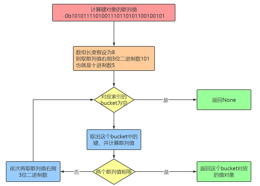 散列值的不同位置的数字。 假设数组长度为8,我们可以拿计算出的散列值的最右边3位数字作为偏移量,即101,十进制是数字5。我们查看偏移量5,对应的bucket是否为空。如果为空,则返回None。如果不为空,则将这个bucket的键对象计算对应散列值,和我们的散列值进行比较,如果相等。则将对应“值对象”返回。如果不相等,则再依次取其他几位数字,重新计算偏移量。依次取完后,仍然没有找到。则返回None。流程图如下: