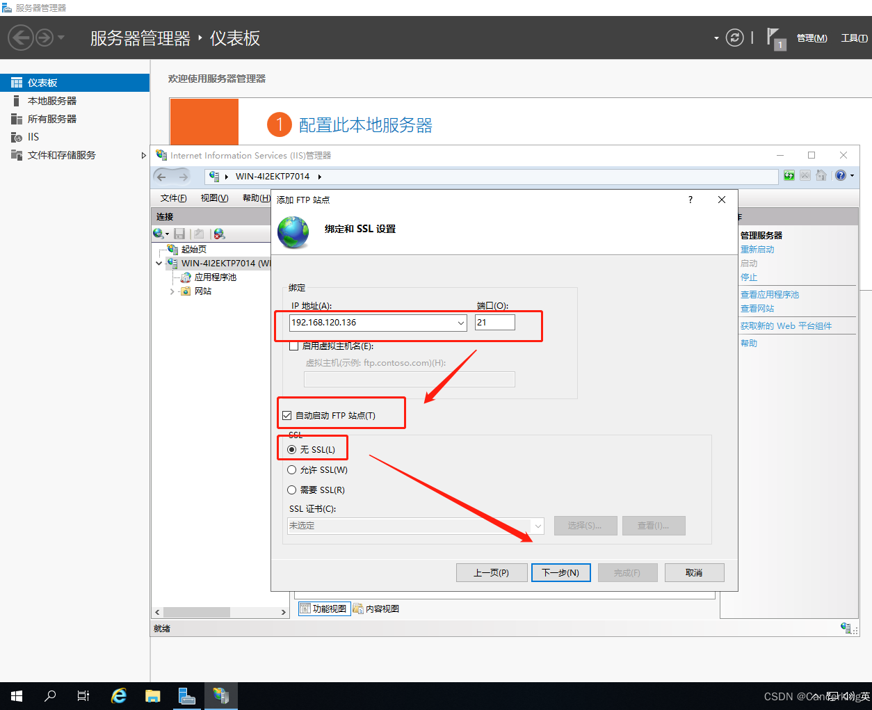 17、绑定IP地址以及端口,安装FTP服务这些功能服务器必须是静态IP地址,否则无法访问,FTP服务默认端口是21,实际应用中最好是改一个端口,这里因为是仅做演示用,很多选择默认就行,最后直接“下一步”