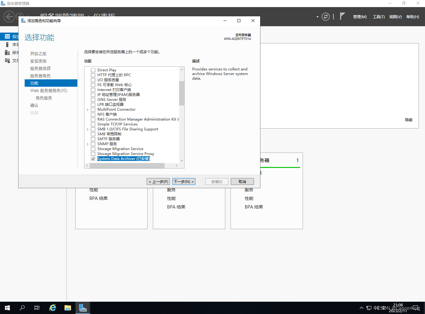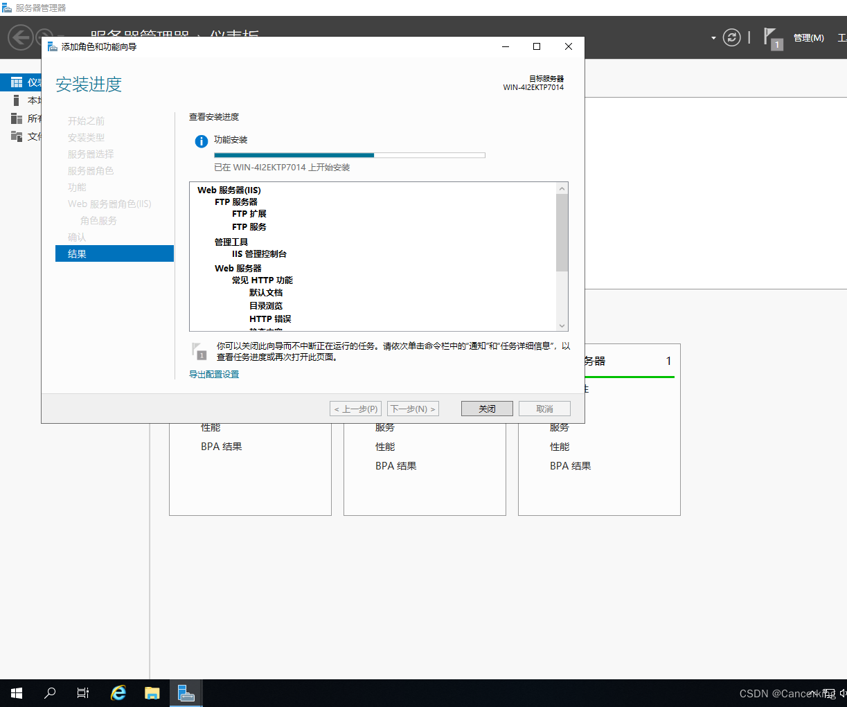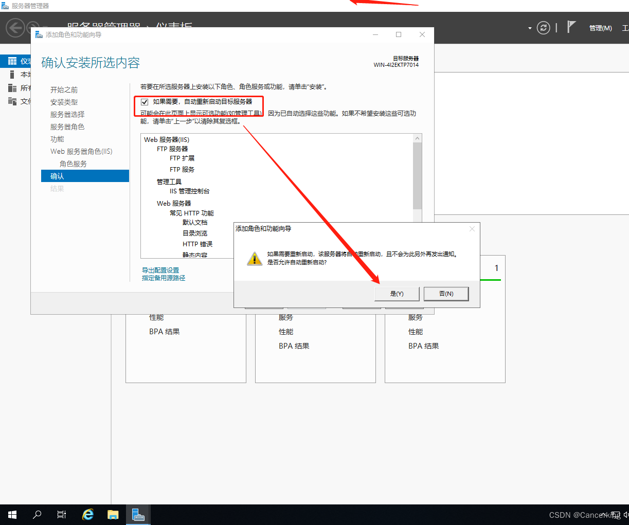 11、勾选“如果需要,自动重新启动目标服务器”后弹出“添加角色和功能向导”,然后选择“是”,再然后点击“安装”,此时开始安装FTP服务等功能
