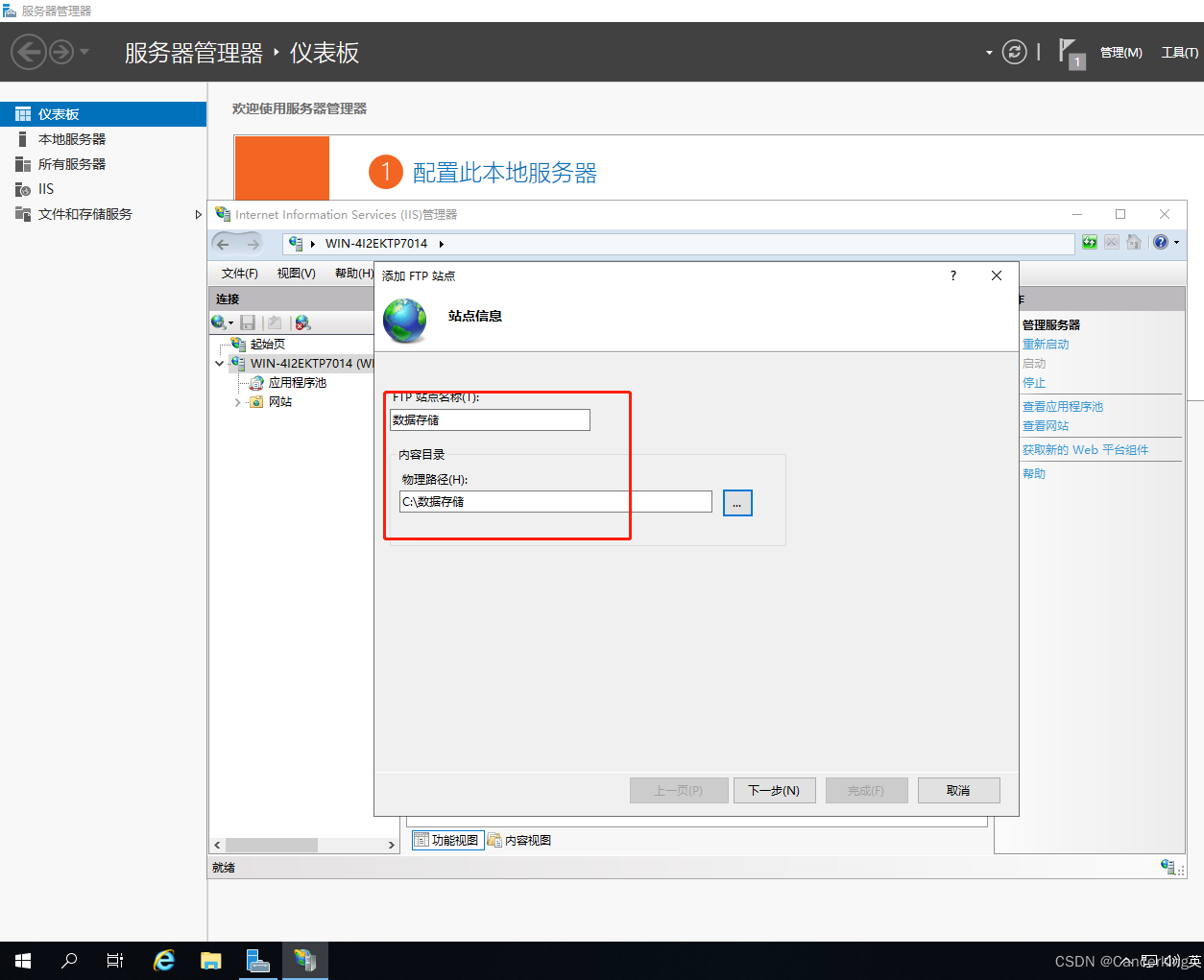 16、接下来是设置“FTP站点名称”以及“物理路径”,名称可以自己设置一个想要的名称就行,存储路径自己选择一个就是,我演示选择的C盘自己添加的一个目录,在实际的安装过程中可以选择其他盘符的目录下,最后点击“下一步”