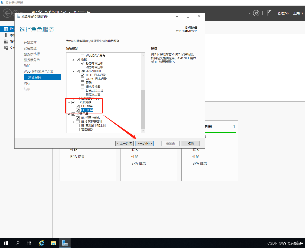 10、勾选“FTP服务器、FTP服务以及FTP扩展”,然后“下一步”