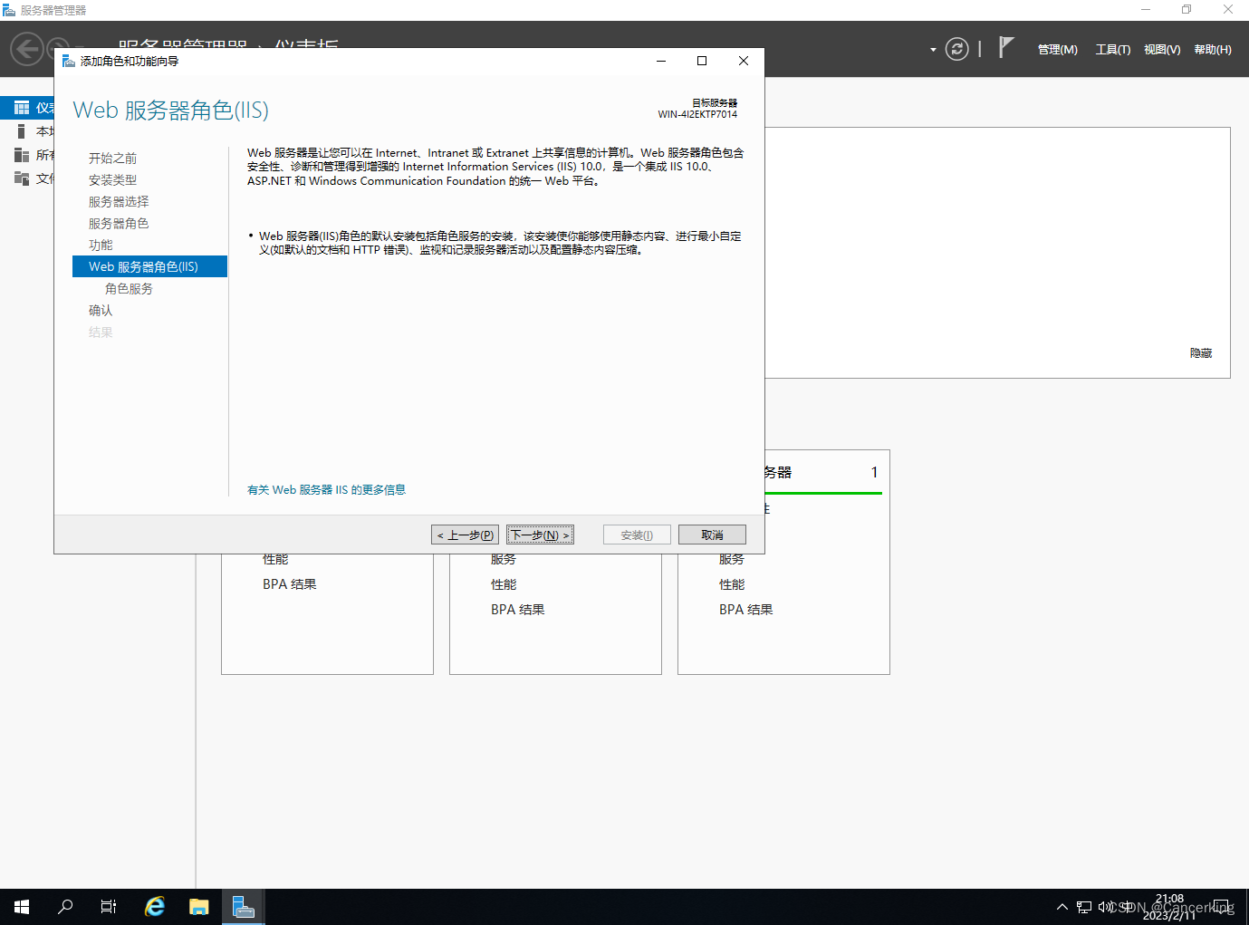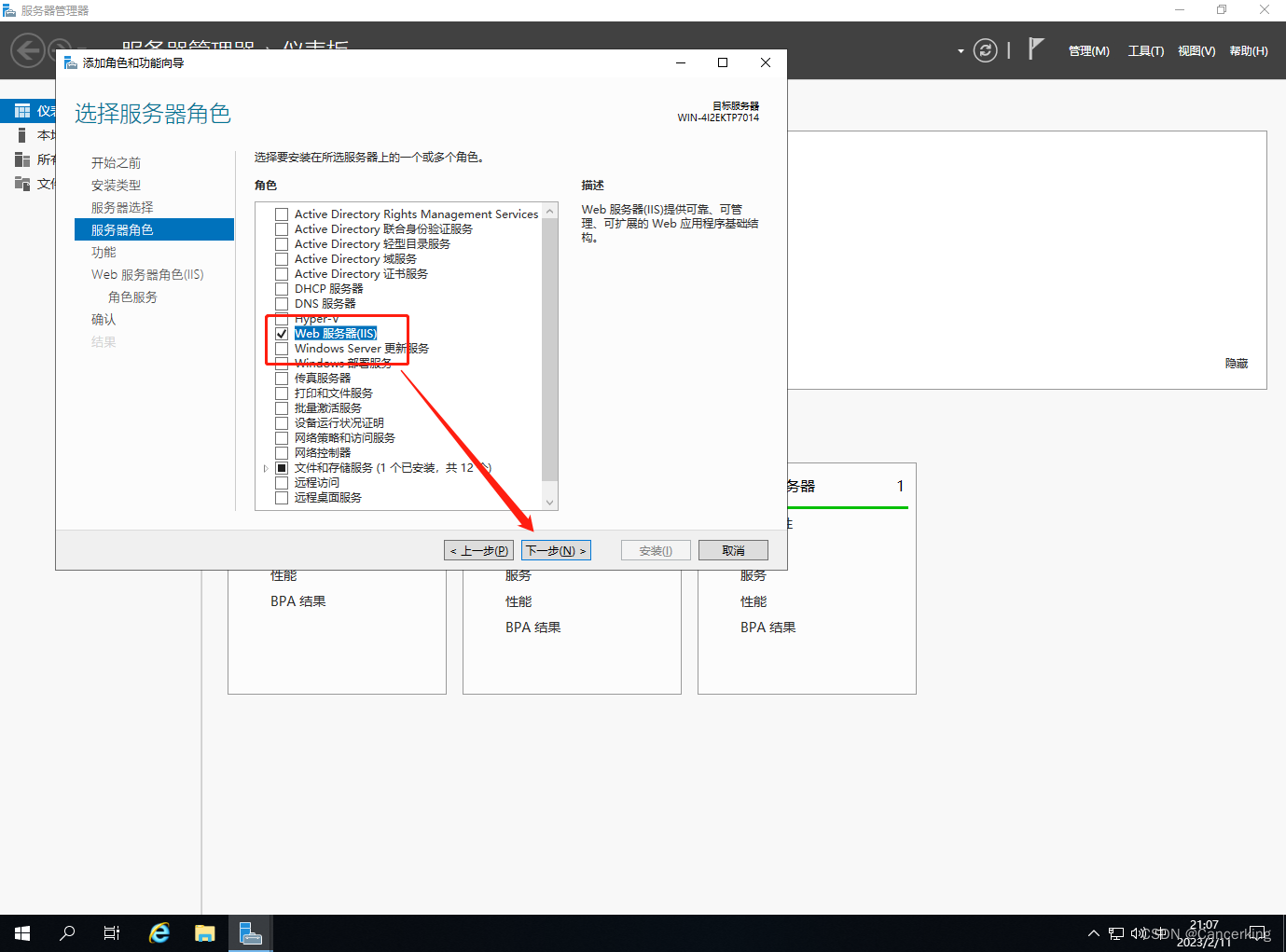 7、在第6步完成后“Web 服务器(IIS)”前面的复选框才会打勾,然后直接“下一步”