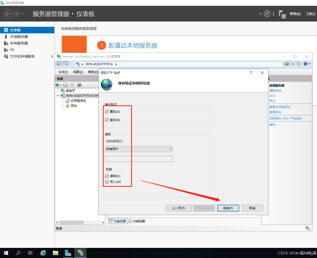 18、身份验证选择“基本以及匿名”,授权选择“所有用户”,权限选择“读取和写入”,然后点击“完成”