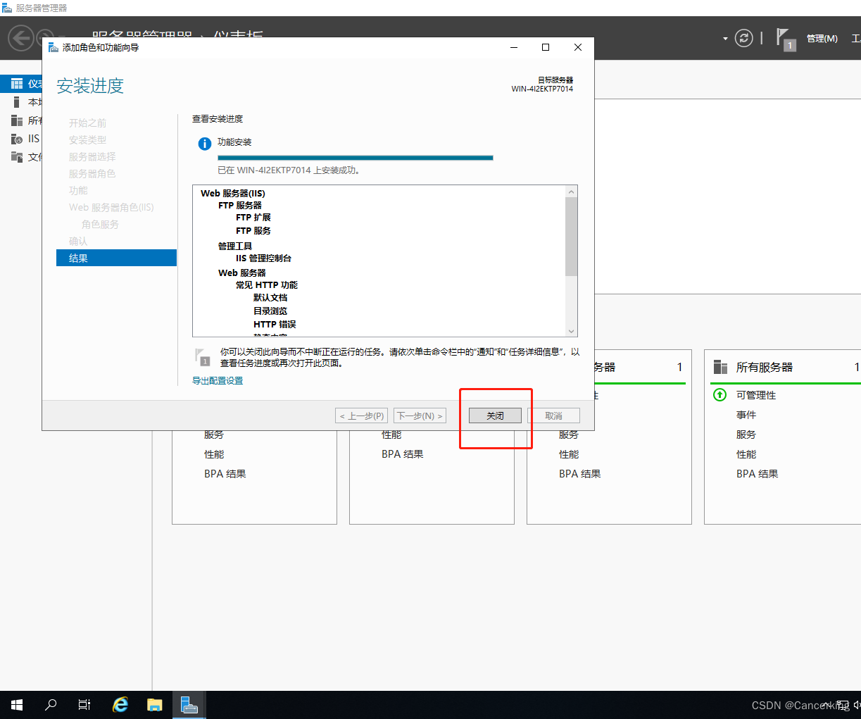 13、安装完成点击“关闭”,到此FTP服务已经安装完成,接下来是添加FTP站点