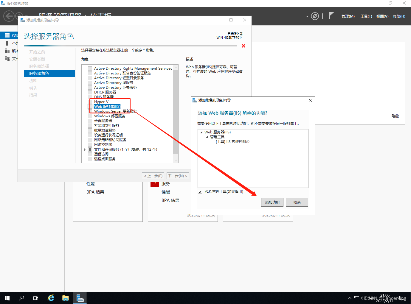 6、接下来选中“Web 服务器(IIS)”后会弹出来一个“添加角色和功能向导”的页面,在弹出的页面中选择“添加功能”