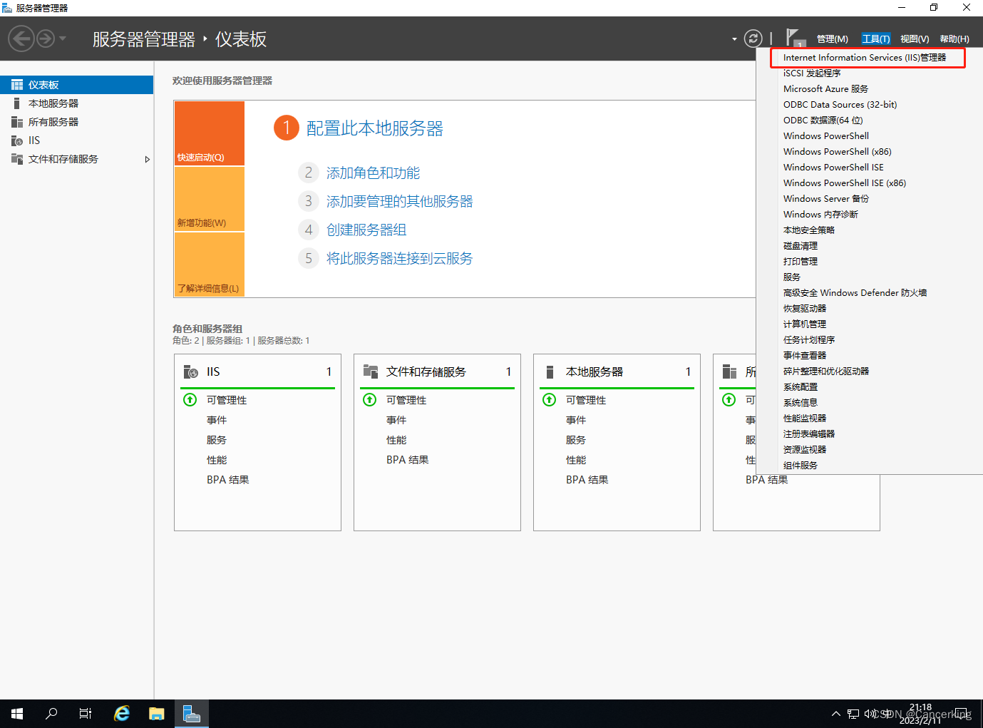 14、在服务器管理器中选择“工具”,然后选择第一项“Internet Information Service(IIS)管理器”
