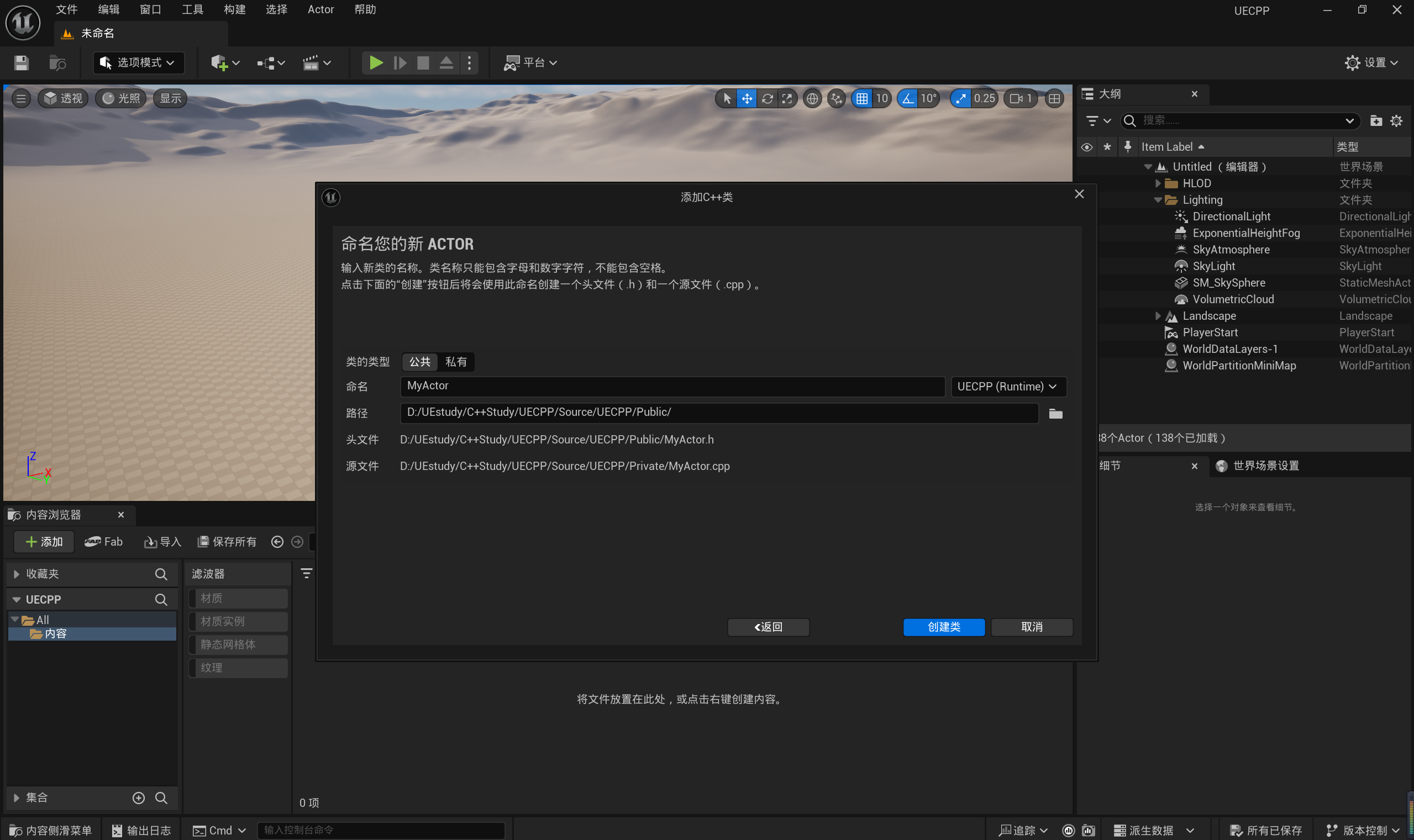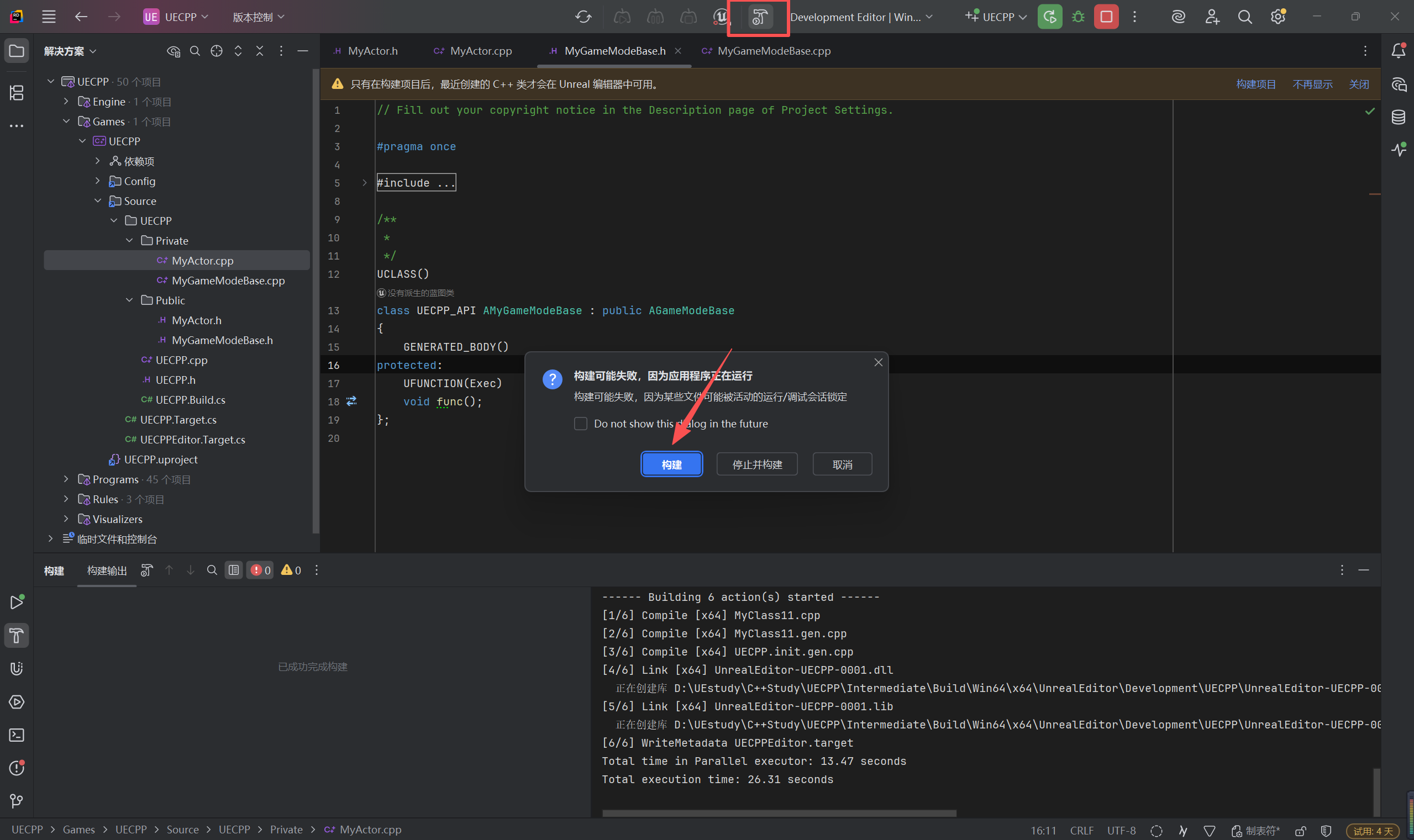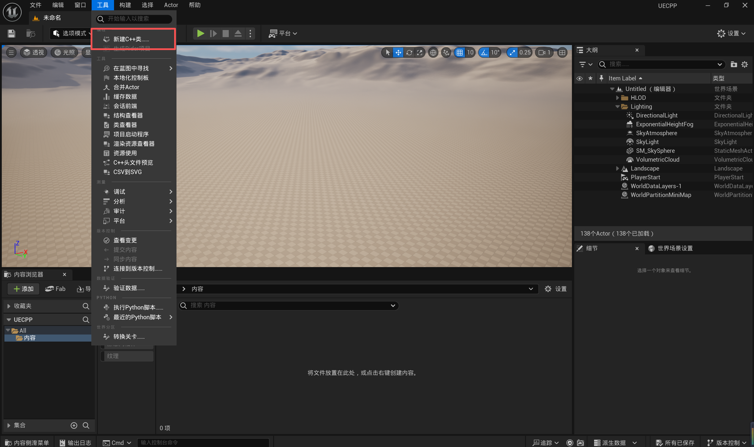 对于纯蓝图项目,我们通常双击 UECPP.uproject 进入虚幻引擎编辑器。但是对于 C++ 项目,我们通常双击 UECPP.sln 进行 C++ 编程与调试。