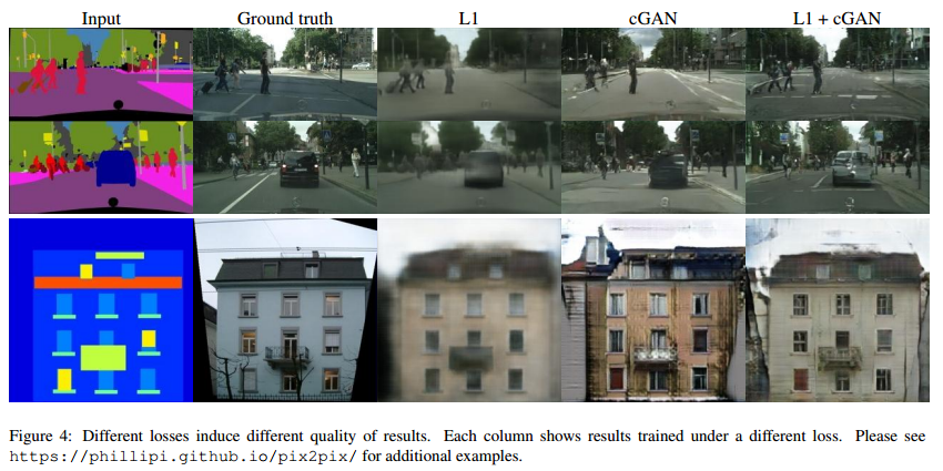 先前的方法通过混合了GAN目标函数和一个传统的损失(如L2 distance)得到更好的结果来验证conditional GANs是有效的。判别器的任务保持不变,而生成器不仅要蒙蔽判别器,还要使得output在L2 distance上逼近ground truth。与L2相比,文章采用了模糊更少的L1 distance: