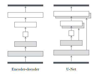 之前的结构都是基于如下图的编码-解码网络,先经过几个降采样层,到达一个瓶颈后经过一个逆过程得到最终的输出。网络要求所有的信息流通过网络的所有层。对于许多图像翻译问题,输入和输出之间共享了大量低级别的信息,因此最好将这些信息直接穿过网络。为了使得生成器能够规避这样的信息瓶颈,遵循“U-Net”的形状,添加跳跃连接。假使网络有n层,网络的第i层都和n-i层有一个连接: