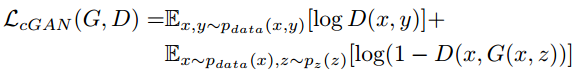 GAN的生成模型是学习一个从随机噪声z到输出图像y的映射G:z->y;而conditional GAN的生成模型是学习从观测图像x和随机噪声z到y之间的映射G:{x,z}->y。conditional GAN训练过程如下图所示: