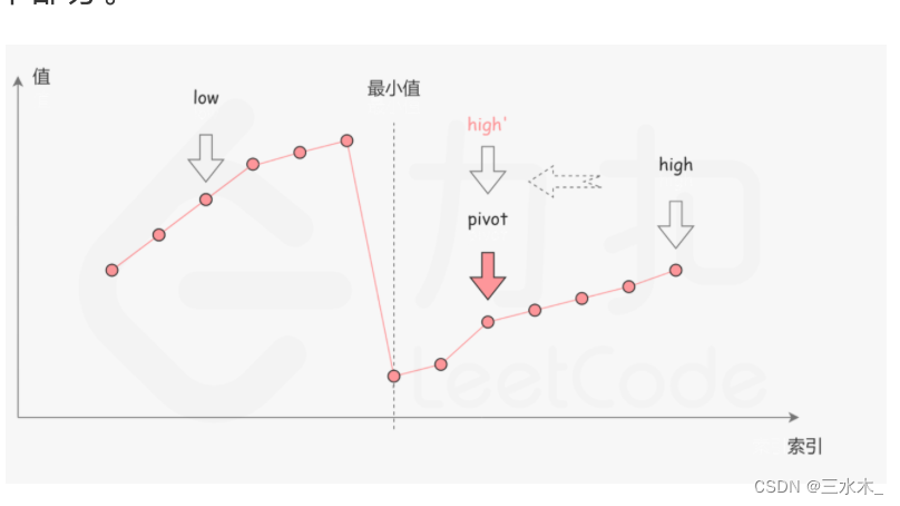 但是还是抓住nums[mid]一定是小于等于nums[high]关键,也就是一定在high左边