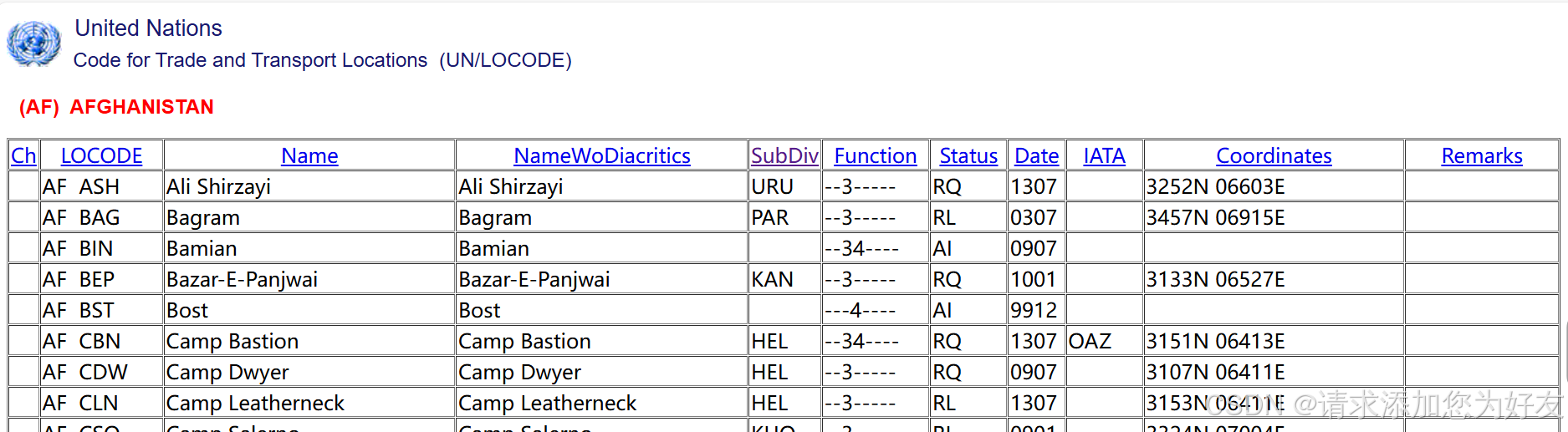 df = pd.DataFrame(data, columns=['Country', 'LOCODE', 'Name', 'SubDiv', 'Coordinates'])
