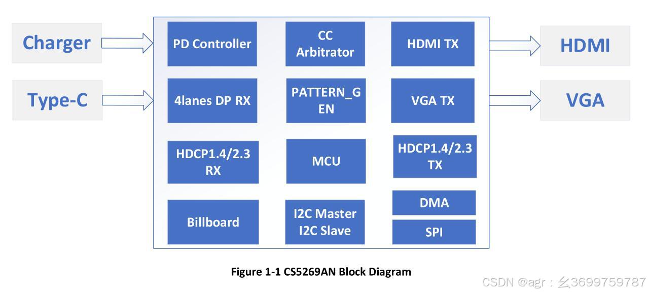 CS5269是一款高度集成的多功能芯片,专为Type-C转HDMI/VGA扩展坞设计。它能够将笔记本电脑、手机等设备的Type-C或DisplayPort 1.4信号,转换为HDMI 2.0b和VGA输出,同时支持PD3.0快充协议,满足用户对高清视频输出与大功率充电的双重需求。
